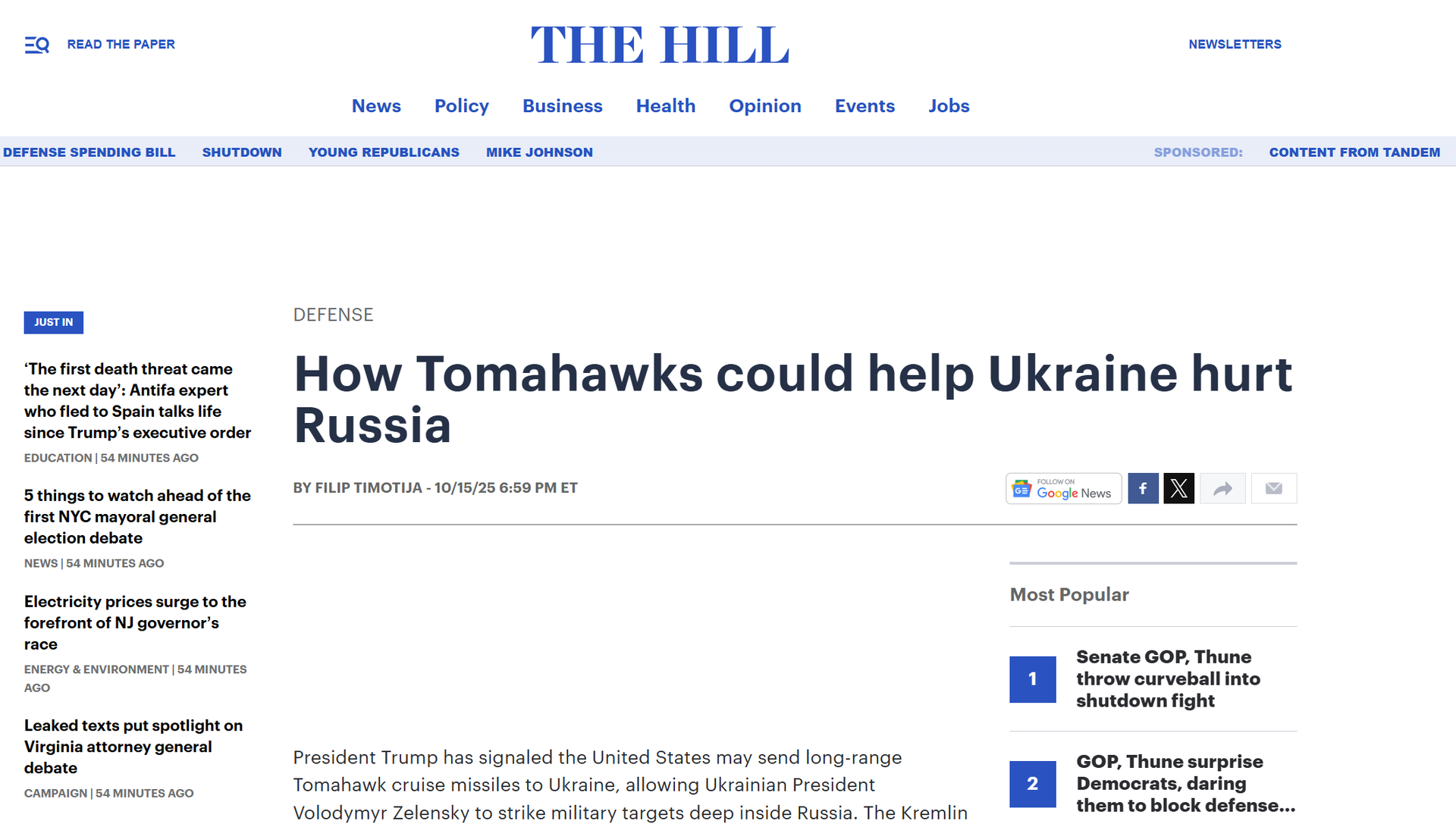 Запланированный на 17 октября визит Владимира Зеленского в Белый дом подстегнул интерес западных СМИ к возможным поставкам американских ракет «Томагавк» на Украину.