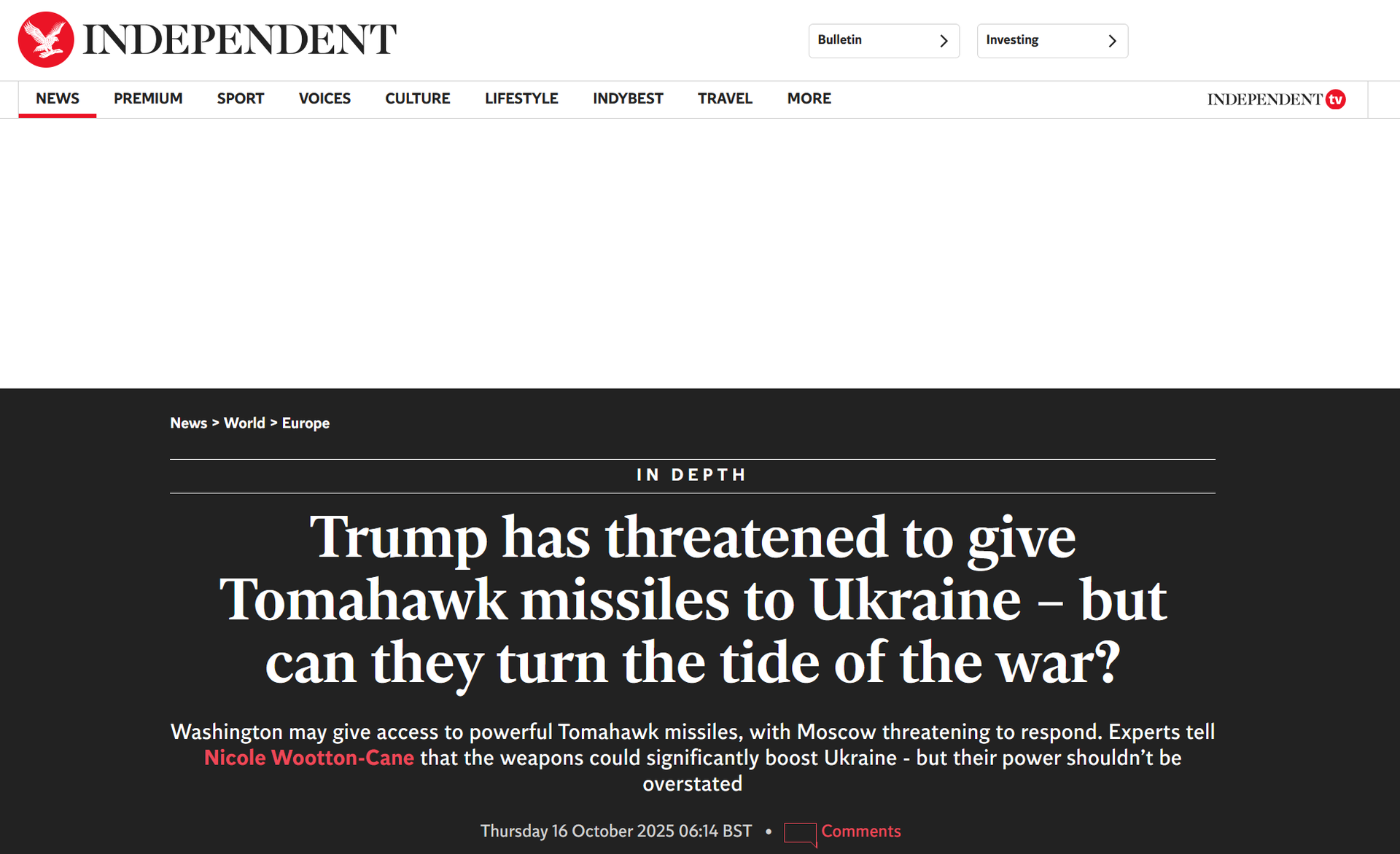 Крылатые ракеты «Томагавк», которые «неоднократно и с каждым разом всё настоятельнее» выпрашивал у США Зеленский, могли бы «существенно расширить» возможности Украины, однако их «не следует переоценивать», пишет The Independent.